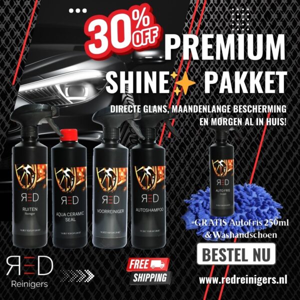 Met het RED Premium Shine Pakket kies je voor kwaliteit zonder concessies. Onze producten zijn ontwikkeld, getest en geproduceerd in Nederland en het Verenigd Koninkrijk – geen goedkope, verdunde of onbetrouwbare Chinese import. Je krijgt pure kracht en premium resultaat.